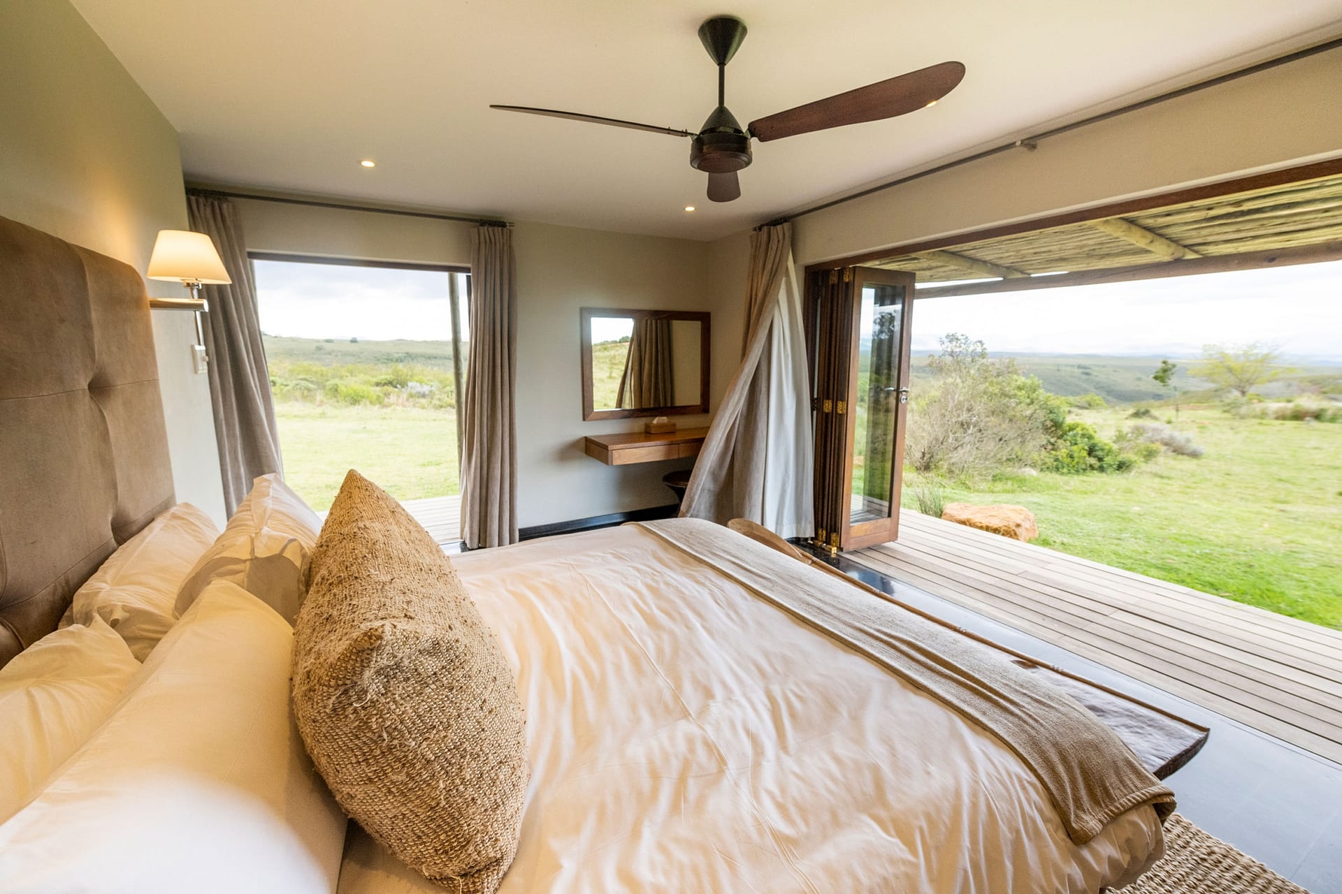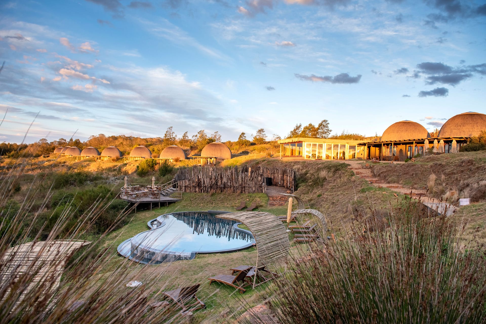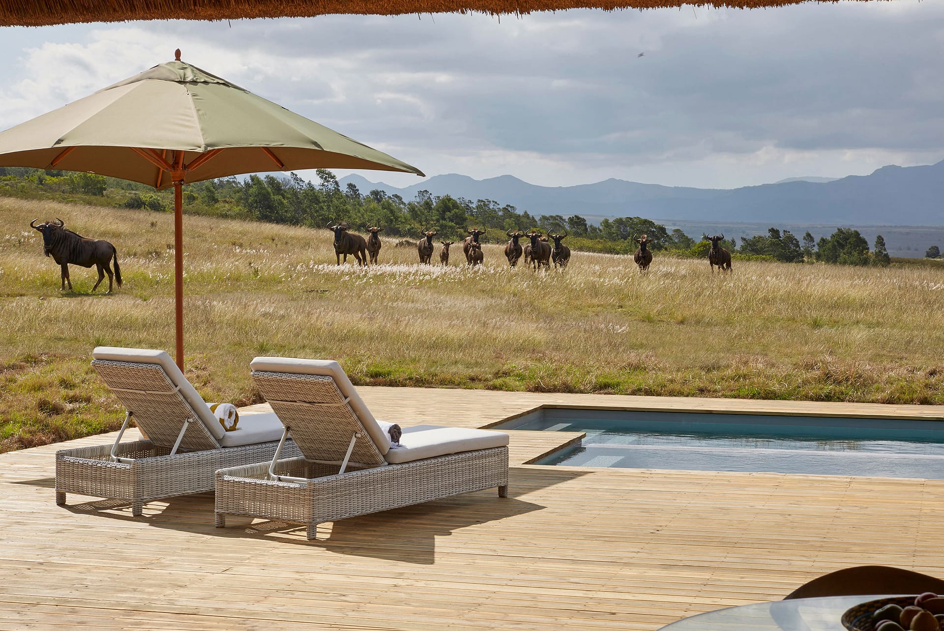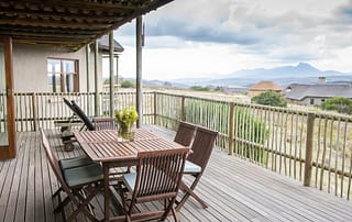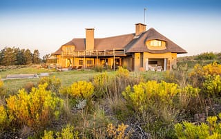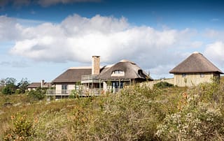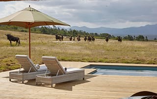With 180-degree views of grass plains dotted with game, fynbos-covered rolling hills, and the Outeniqua mountain range, Ulubisi House is tucked away in the reserve’s 1000-hectare protected walking area for endangered species.