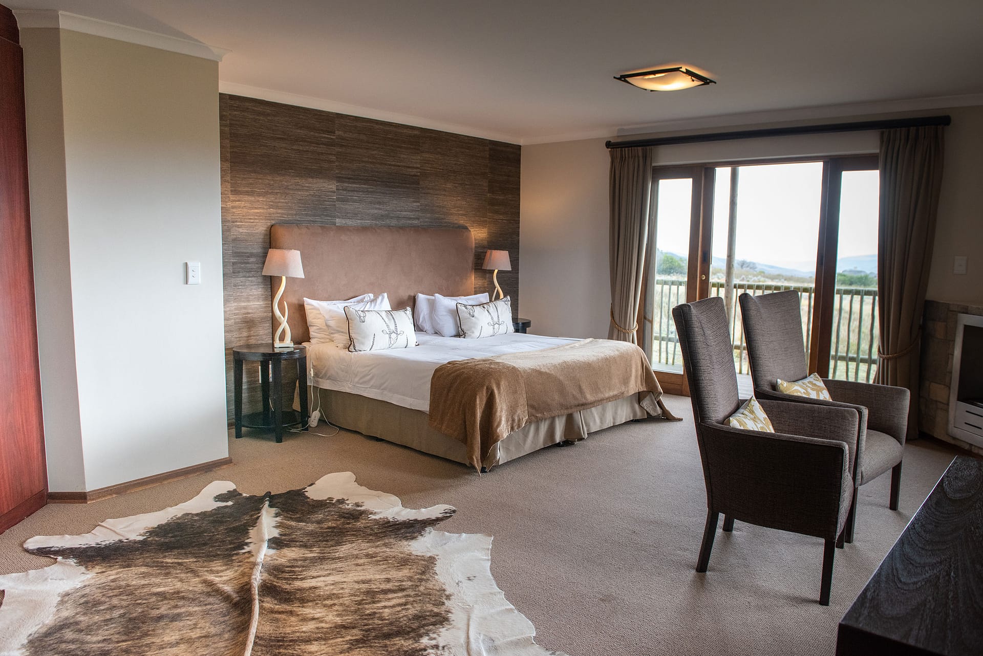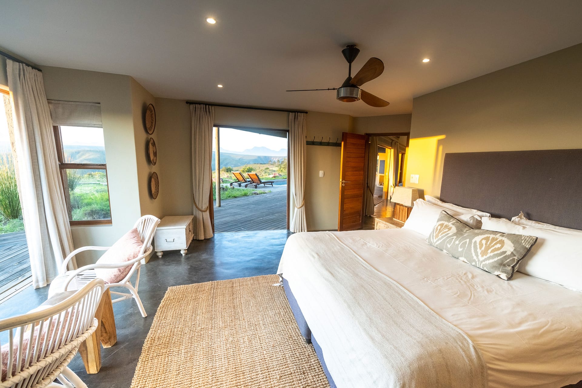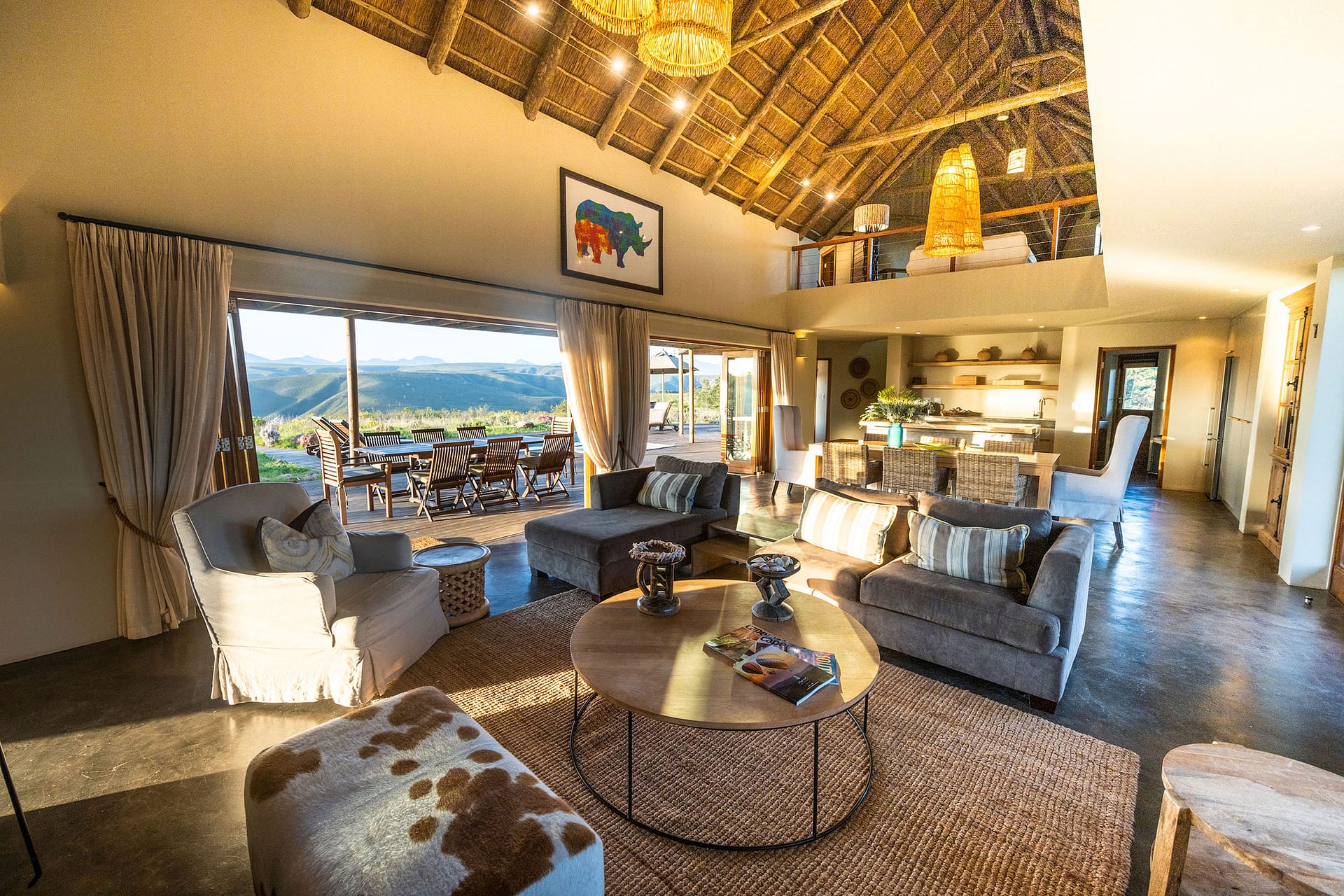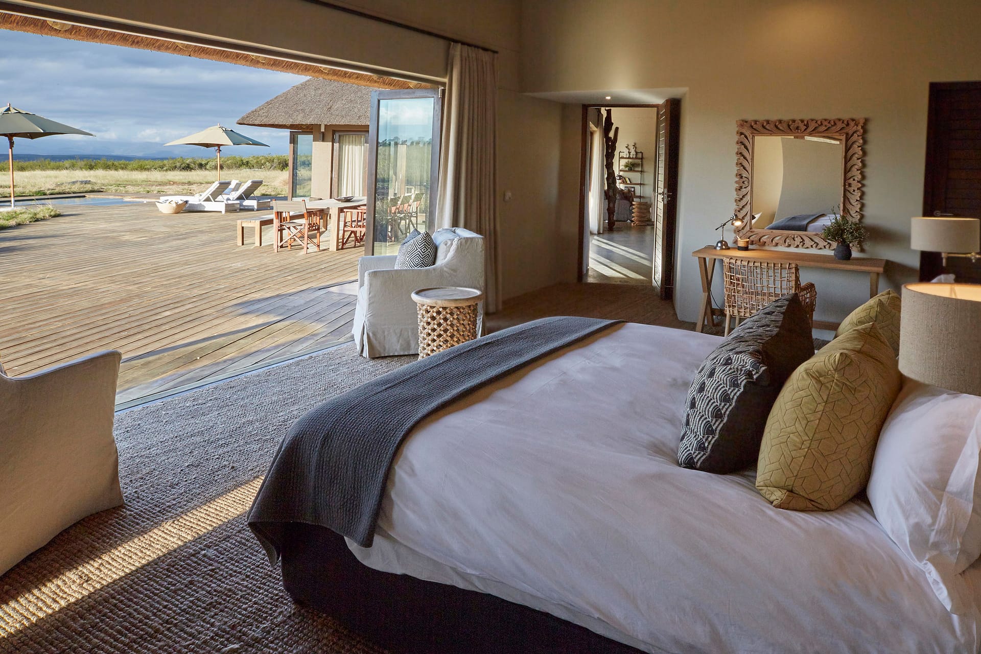 With 180-degree views of grass plains dotted with game, fynbos-covered rolling hills, and the Outeniqua mountain range, Ulubisi House is tucked away in the reserve’s 1000-hectare protected walking area for endangered species.