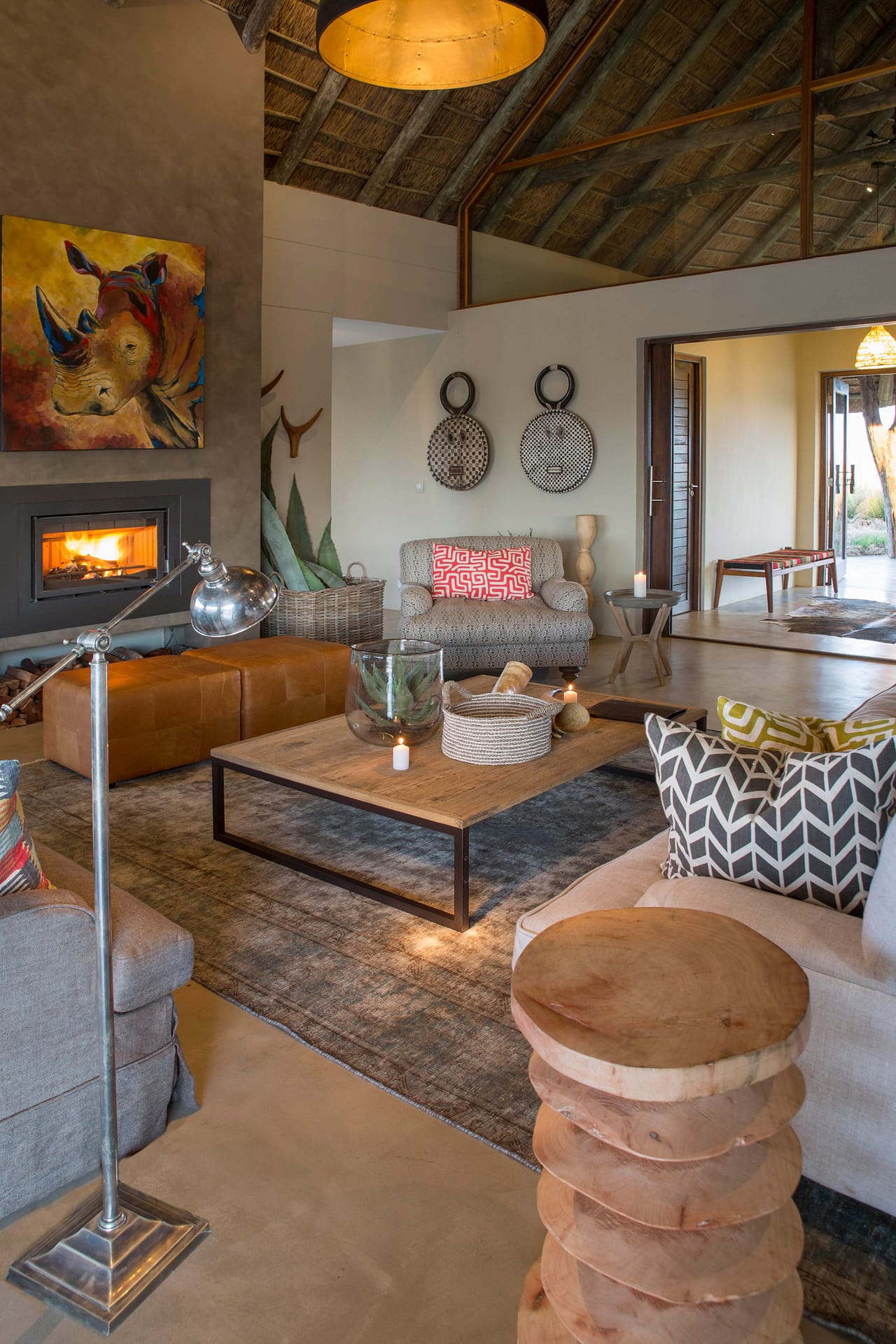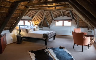 Kwena lodge offers an opulent take on the traditional Khoi-San dwelling. Each spacious suite offers panoramic views of the incomparable natural beauty of the park outside and feature unique skylights above the sleeping area so you can sleep under the African sky.
